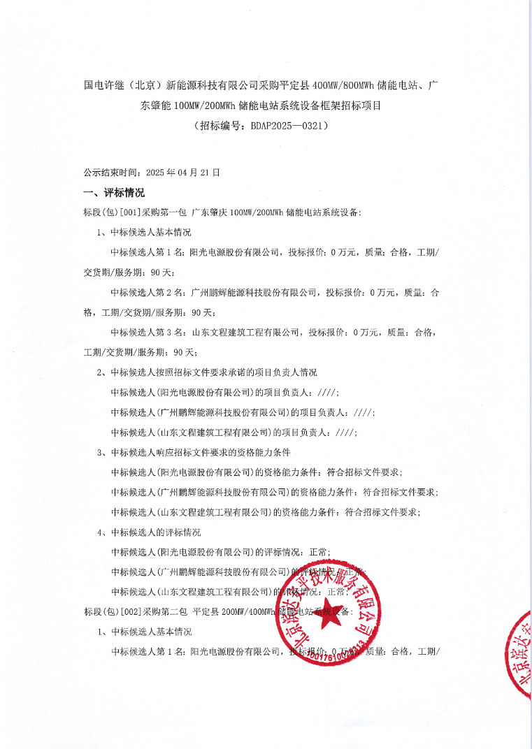 储能与电力市场获悉,4月16日,国电许继(北京)新能源科技有限公司采购山西平定县400MW/800MWh储能电站、广东肇能100MW/200MWh储能电站系统设备框架招标项目中标候选人公示。项目总规模为500MW/1000MWh,阳光电源预中标。